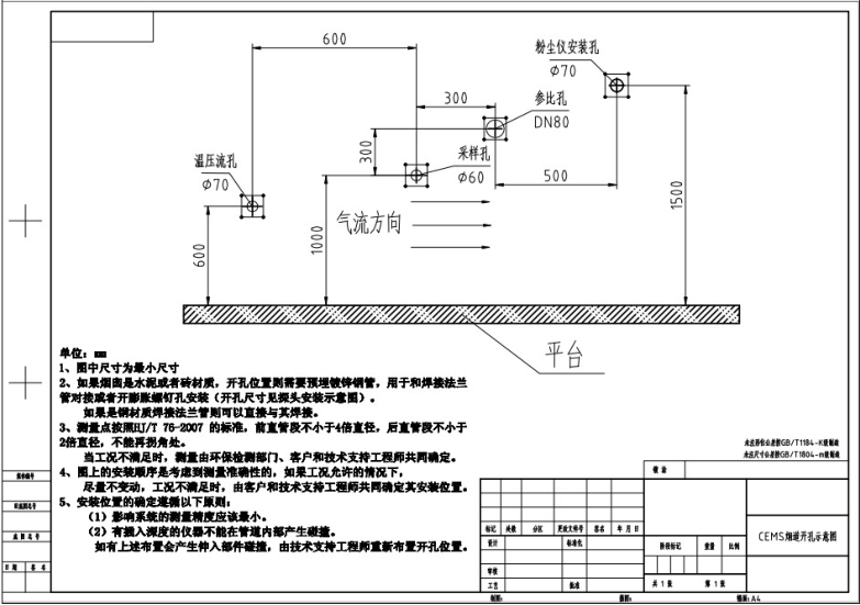 煙氣在線監(jiān)測(cè)系統(tǒng)在煙囪上的開孔位置大概在:煙囪直徑的4倍處(變徑之上),根據(jù)煙囪氣流的方向,從左往右開孔依次是:溫壓流孔、氣體采樣孔、環(huán)保參比孔、粉塵(顆粒物)取樣孔、濕度孔5個(gè)取樣孔。孔徑的大小:溫壓流孔70mm/采樣孔60mm/參比孔80mm/粉塵孔70mm。