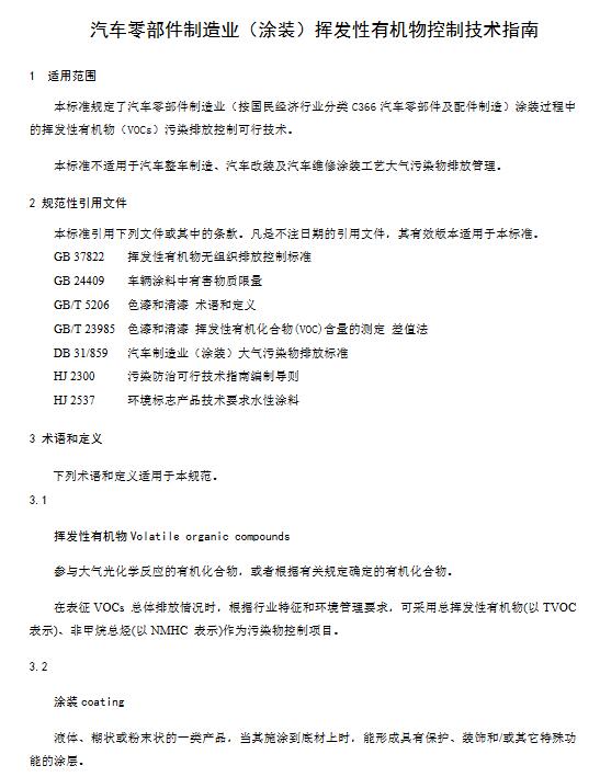 本標準規(guī)定了汽車零部件制造業(yè)(涂裝)揮發(fā)性有機物污染防治可行技術。 本規(guī)范按照GB/T 1.1-2009給出的規(guī)則起草。