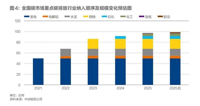 在碳市場涵蓋的范圍方面,未來以怎樣的節(jié)奏納入更多行業(yè),尚未明確。首個控排行業(yè)發(fā)電行業(yè)的碳排放總量約為40億噸,若電解鋁、水泥、鋼鐵、化工、造紙、石化、航空等七大高耗能行業(yè)全部納入全國碳市場,碳排放總量預計在80億/年噸至100億噸/年之間。