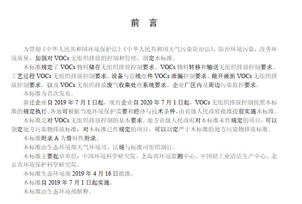 日前,環(huán)境部發(fā)布了《揮發(fā)性有機(jī)物無(wú)組織排放控制標(biāo)準(zhǔn)》(GB 37822—2019)。