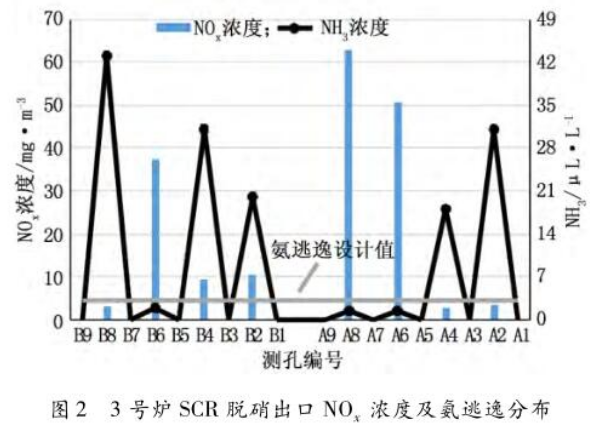圖1 3號爐SCR脫硝出口NOx濃度及氨逃逸分布