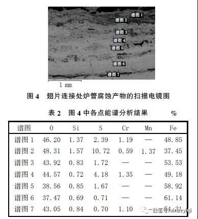 對翅片連接處爐管腐蝕產物進行了掃描電鏡及能譜分析,結果見圖4 和表2。由圖4 和表2 可知,腐蝕產物中O 元素質量分數較高,且沿徑向方向由內到外大致呈降低趨勢,由48%降至37%;腐蝕產物中存在一定量的S 元素,且存在硫富集帶,其S 元素質量分數高達10%(譜圖2)。以上分析表明,爐管存在嚴重氧化現象以及不同程度的硫腐蝕。
