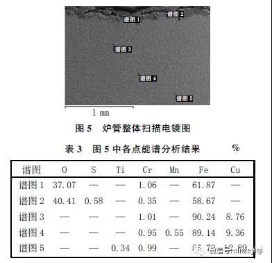 對腐蝕較輕的爐管進行了掃描電鏡及能譜分析,結果見圖5 和表3。由圖5 可知,爐管表面存在腐蝕層,平均在0.2 mm 左右。由表3 可知,腐蝕層(譜圖1、2) 中存在大量的O 元素,此外還發現少量的S 元素,而爐管內部未發現O 元素和S 元素,表明爐管外側發生了較為嚴重的氧化腐蝕。