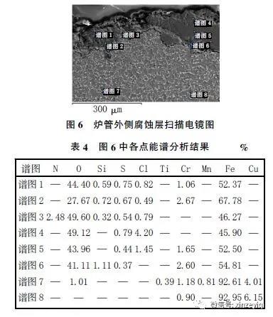 熱管換熱器爐管外側及翅片發生了嚴重氧化腐蝕及輕微硫腐蝕、氯腐蝕。由于焦爐煙氣中含有體積分數6%~10%的氧氣,氨法脫硫后的煙氣中水分可達到15%~20%,熱管換熱器爐管及翅片具備被氧化的客觀條件,尤其是低溫冷凝段煙氣中水分含量會更高,因此低溫段腐蝕現象最為嚴重。由于煙氣脫硫后,煙氣中SO2 含量非常低,其質量濃度為0~10 mg/m3,因此熱管換熱器硫腐蝕現象并不明顯。遷安中化公司爐管材質是ND 鋼,耐低溫硫腐蝕,不耐氧腐蝕,已不能滿足目前的工藝條件,因此建議將熱管換熱器腐蝕最為嚴重的低溫段材質由ND 鋼更換為更耐氧腐蝕和硫腐蝕的2205 不銹鋼,以滿足脫硫脫硝系統的長期穩定運行。