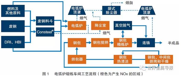對于電弧爐熔煉車間,凡是帶有電弧或燒嘴的工藝或設(shè)備都應(yīng)被視為NOx的排放源,但正如本文后面將看到的,實際并不僅限于此。