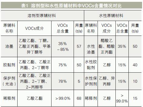某薄膜印刷企業(yè)分別采用溶劑型和水性原輔材料生產(chǎn)同一產(chǎn)品的情況下,VOCs的成分及含量對(duì)比情況見(jiàn)表1。該企業(yè)改用水性材料后,VOCs產(chǎn)生量減少了約80%??梢?jiàn)采用水性原輔材料可大大減少VOCs排放種類和數(shù)量。
