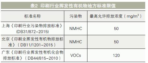 塑料軟包裝印刷企業(yè)產(chǎn)生的廢氣量較大,大部分企業(yè)VOCs濃度在5000ppm以下,屬中低濃度,其中烘干廢氣的溫度通常在50~80℃,VOCs年排放總量大。目前國(guó)內(nèi)對(duì)于印刷行業(yè)VOCs排放執(zhí)行的標(biāo)準(zhǔn)主要為地方標(biāo)準(zhǔn),具體見(jiàn)表2。南京地區(qū)主要參照的是上海市《印刷行業(yè)污染物排放標(biāo)準(zhǔn)》(DB31/872-2015)。